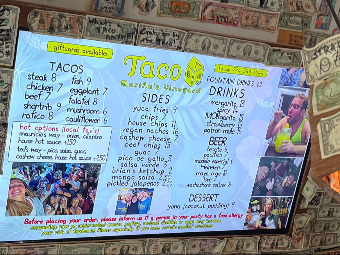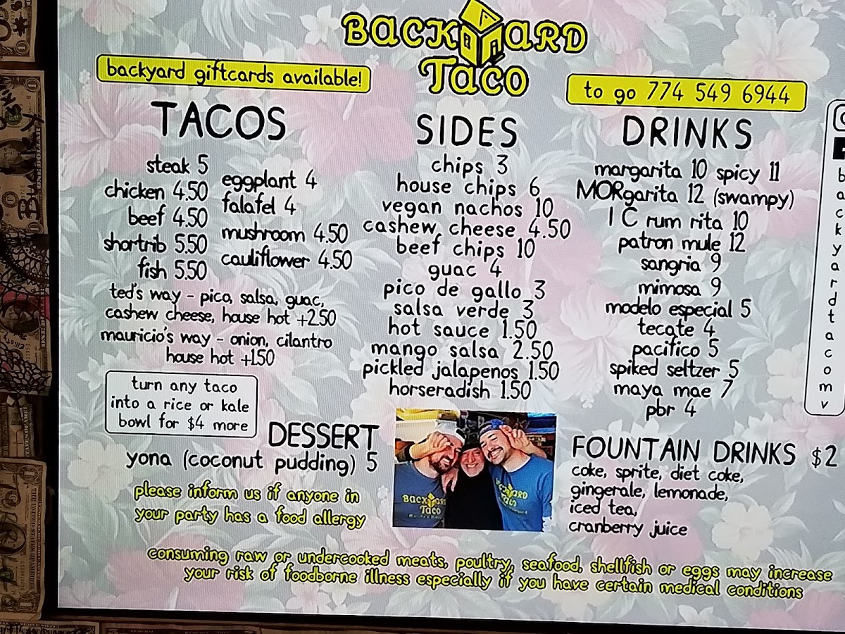 As a final takeaway, the menu at Backyard Taco at 32 Winter St, Edgartown delivers a focused yet satisfying snapshot of casual coastal dining with bold, approachable flavors. From the taco lineup-Steak, Chicken, BeefFish, and Falafel-there’s a clear effort to balance hearty classics with lighter, plant-forward options, making the menu welcoming to different tastes. The sides, including Pico De Gallo, Salsa Verde, Brian’s KetchupMango, and House Chips, complement the tacos well, adding freshness, acidity, and crunch without overcomplicating the experience. On the drinks side, the Patron Mule stands out as a refreshing cocktail choice, while beer lovers can rely on familiar labels like Modelo Especial, Heineken, Maya MaeLove, and Washashore Seltzer for easy pairing. For something sweeter, Yona offers a simple dessert finish, rounding out the meal nicely. The “Others” section-with options such as Mauricio’s Way, Ted’s Way, MargaritaIc Rum Rita, and Sangria-adds personality and customization, reinforcing the relaxed, backyard-style vibe the restaurant aims for. Overall, Backyard Taco’s menu feels cohesive and intentional, serving as a strong conclusion to the dining experience: uncomplicated food, recognizable names, and a balance of comfort and freshness that fits perfectly with its Martha’s Vineyard setting.